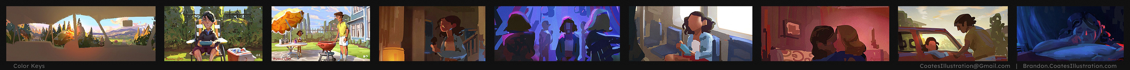 Below is an animated short advertisement I art directed for. I created a guiding document to build a direction for the project, create concept art, and provided paintovers and feedback to guide artists. Below I've included the color script I created to act as an early "north star" to help guide the project, some GIFs to showcase snippets from the final production, and two concepts for the environment design.